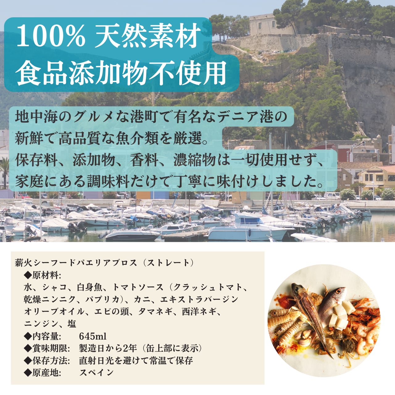 化学調味料や保存料は一切不使用。100%スペイン産の天然素材だけを厳選し、薪火で炊き上げたパエリア用スープです。お好みの具材とお米を加えて18分炊くだけで、濃厚な魚介類の風味と薪の薫りを堪能できるシーフードパエリアが完成します。