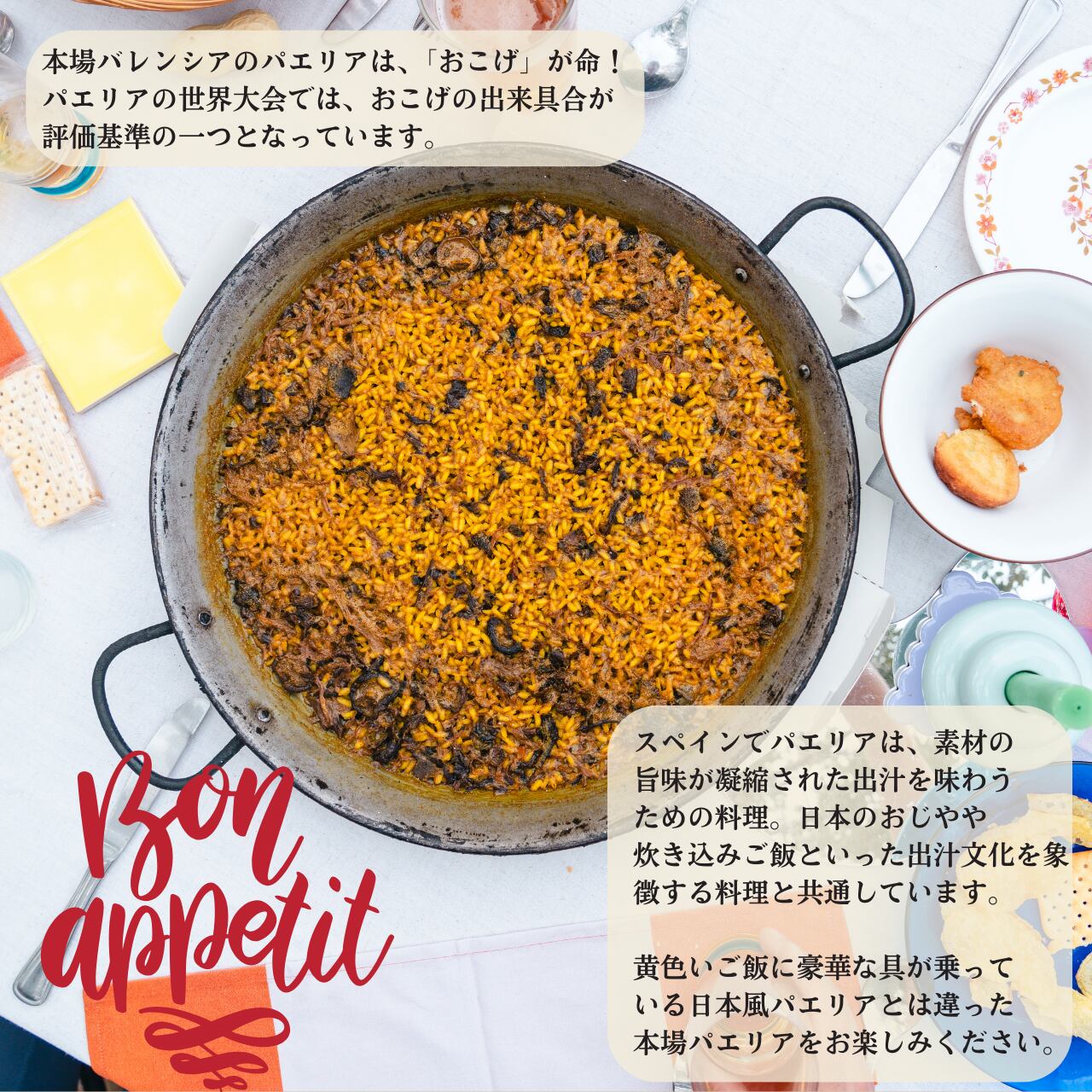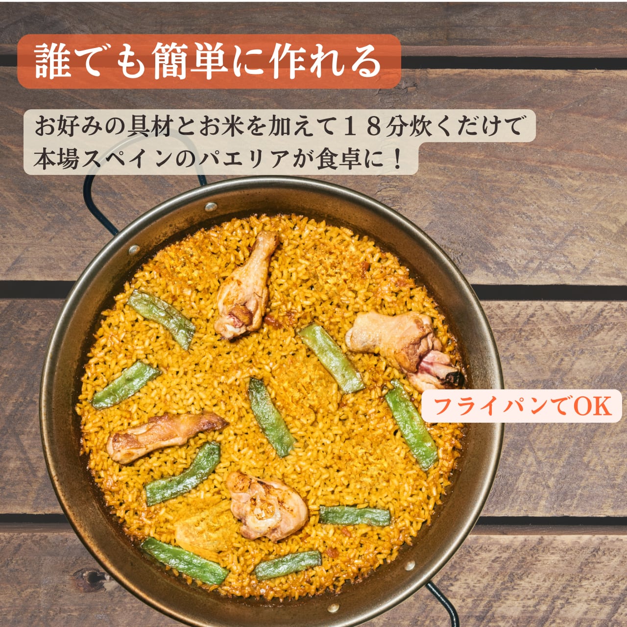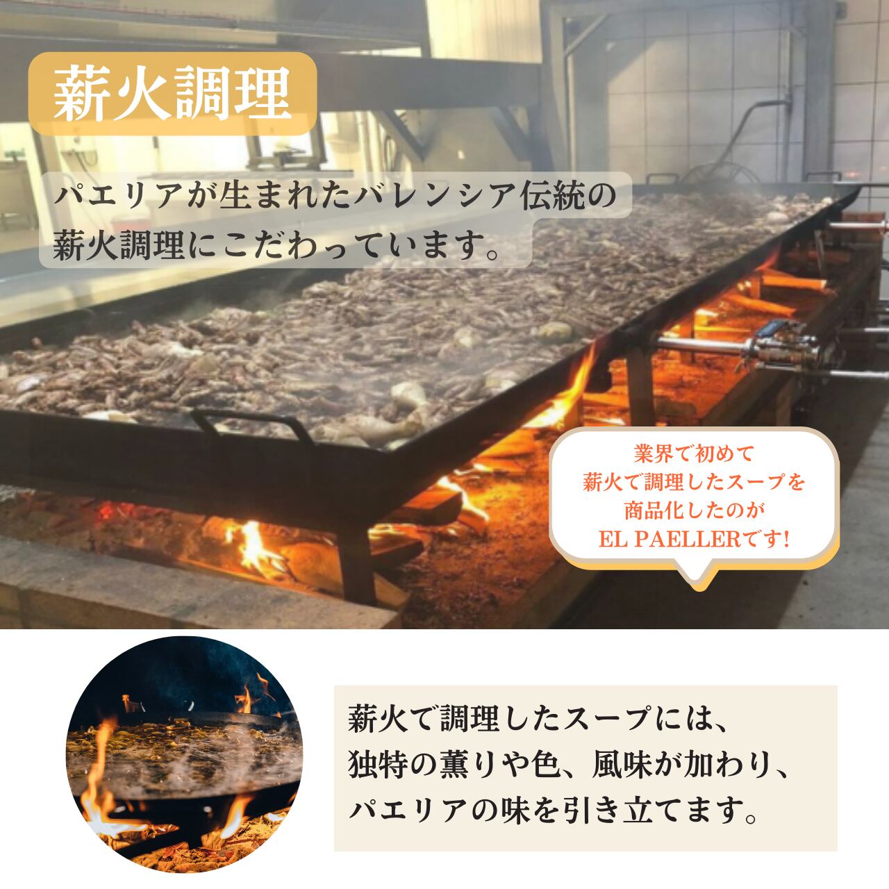 化学調味料や保存料は一切不使用。100%スペイン産の天然素材だけを厳選し、薪火で炊き上げた具入りパエリア用スープです。
