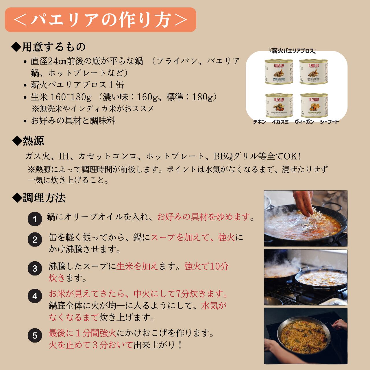 化学調味料や保存料は一切不使用。100%スペイン産の天然素材だけを厳選し、薪火で炊き上げたチキンスープです。お好みの具材とお米を加えて18分炊くだけで、優しい鶏肉の風味と薪の薫りを堪能できるパエリアが完成します。