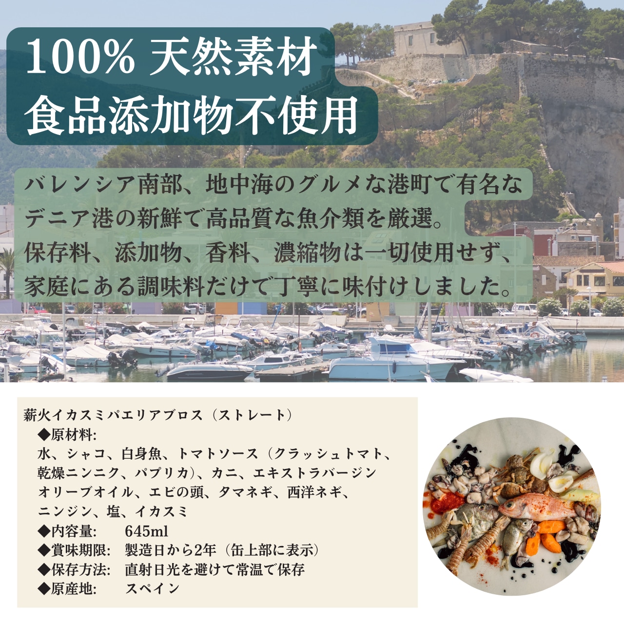 化学調味料や保存料は一切不使用。100%スペイン産の天然素材だけを厳選し、薪火で炊き上げたイカスミスープです。お米を加えて18分炊くだけで、レストランで味わうような濃厚なイカの風味と薪の薫りを堪能できるイカスミパエリアが完成します。